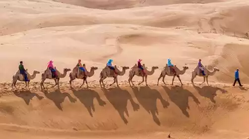After breakfast, we'll visit the magical Singing Sand Bay Scenic Area within the desert. A true masterpiece of nature, it's named after the "sand here can sing." The sand is 110 meters high, with a 45-degree slope, forming a crescent-shaped echo wall. The towering dunes stand shoulder to shoulder, creating a vast expanse of boundless sand.