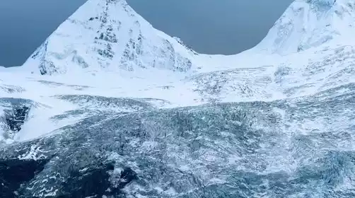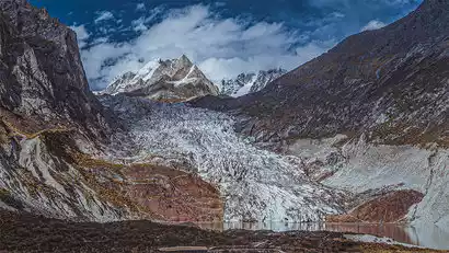 Arriving at the largest valley on the south slope, you will see the glacier. The glacier has a wide snow basin and a large accumulation area. Its ice tongue is narrow and long, with the end at an altitude of 4,200 meters. There are moraine ridges from the Little Ice Age around the front end of the ice tongue. You can follow the plank road directly to the front of the glacier's ice lake and face the glacier directly, which is very shocking.