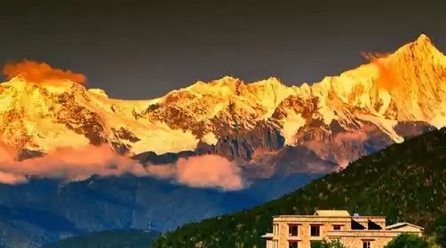 Get up early and enjoy the golden sunshine on the Meili Snow Mountain. The Kawagebo and Mentsim Mountains are shining brightly under the golden light, which is a breathtaking beauty.