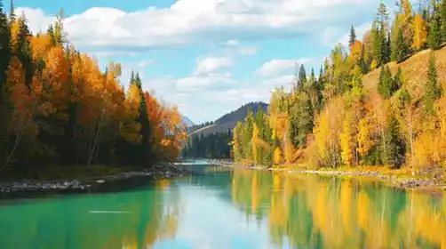 Enjoy a light hike to Sanwan, covering the highlights of the Sanwan area: [Shenxian Bay - Moon Bay - Wolong Bay] (approximately 3-6 kilometers, 1-2 hours, mainly downhill, relatively easy). Get up close and personal with the Kanas River and photograph the reflections of the boundless autumn colors. Enjoy a leisurely walk along the riverside wooden plank path, admiring the stunning autumn scenery of Kanas. Tourists who prefer not to hike can opt for scenic shuttle buses to stop along the way.