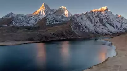 Today we got up early to photograph the sunrise at Pumoyongcuo. This is one of the most beautiful viewpoints for watching Kulagangri: looking out from the north bank, the Kulagangri snow-capped mountains on the left stand proudly. We set up our cameras and waited for the moment when the sun would shine on the golden mountains.