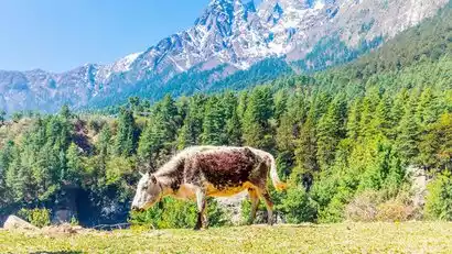 Under a blue sky and white clouds, a small village lies surrounded by snow-capped mountains. Smoke rises from chimneys and clouds billow upwards. Lush greenery lingers between the mountains, while yaks graze leisurely. The crisp tinkle of bells adorning their necks, combined with the occasional chirping of birds, creates a beautiful melody! It's truly enchanting!