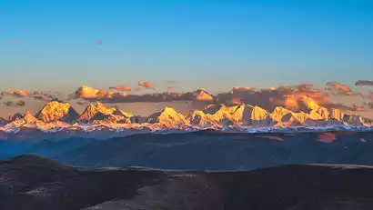 We continue our journey through Xinduqiao Town to Black Stone City, located near the Gaolusi Mountain Pass. Gazing out at the distant Great Snow Mountain Range, with Gongga Snow Mountain as its main peak, rising from the east, gradually dyed golden in the afterglow of the setting sun.