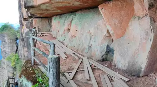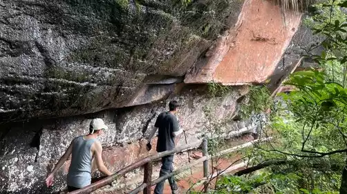 After lunch at the reservoir, we will take a short break and then pass through mountain paths, streams, dense forests, etc., and appreciate the typical karst topography along the way. We will climb over a 15-meter-high steep cliff and arrive at the ruins of the mountain stronghold located halfway up the mountain. The only way to get to the mountain is a 15-meter-high hanging wooden passage carved by bandits on the steep cliff, which can accommodate one person. It is easy to defend and difficult to attack.