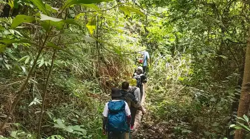 Arriving at the starting point, the team leader will lead a warm-up exercise before starting today's hike. We'll enter the hiking trail, which is undeveloped and a primitive path for hikers. Along the way, we'll need to climb slopes and walk through bushes. Please be sure to wear long-sleeved clothes (or sleeves), a sun hat, and gloves. Trekking poles and knee pads are recommended.