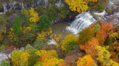 When you come to this scenic spot, you will be attracted by the maple forest all over the sky, and you will be amazed by the cascading waterfall. It is also called Xiaohukou Waterfall.
