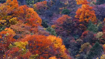 Each character of the Chinese character "天书涯" (Tianshu Cliff) is 5 x 5 meters in size, with a spacing of approximately 4 meters. On the way to Hongchen Gorge, there's a viewing spot for red leaves. The sightseeing bus will stop here, allowing you to disembark and admire the crimson leaves covering the mountain. You can also take in some stunning photos of the foliage.