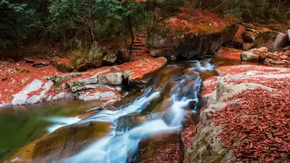 At the right time, we went to [Daxiaolanggou]. Compared with Black Bear Gou, this place has a different feeling. The whole ditch is covered with bluestones, on which thick moss grows, and many red leaves are floating on them. The stream in the ditch is not big, but it is winding, which is another different experience.