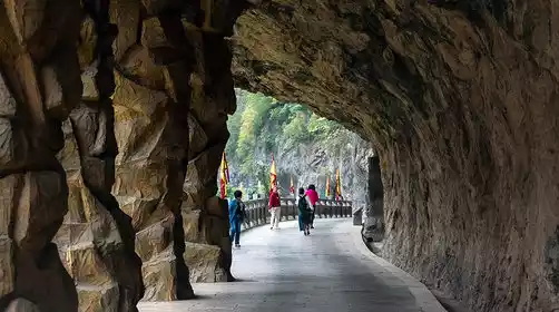 Today, we'll hike the highlight of the Jinniu Ancient Trail. Jianmen Pass has been a military fortress since ancient times. Li Bai's poem "The Difficult Road to Shu" features the line, "Jiangmen Pass is majestic and towering; one man guards the pass, ten thousand men cannot break through." Today, Jianmen Pass has been developed into a scenic area, featuring attractions such as a suspended glass platform, the Tianti Gorge plank road, and a bird's path. The iconic tower has been rebuilt numerous times throughout history, but was destroyed by war or road damage. The current tower is a recent reconstruction. We'll explore Jianmen Pass on foot (ropeway rides are at your own expense). We'll explore the bird's path and the cliff corridor, a scenic route halfway up the mountain. Alternatively, we can choose a river valley hike to experience a blend of culture and scenery. The Monkey Path is a reflection of the ancient path of that time.