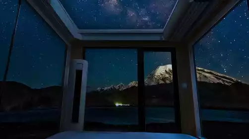 The campsite is located on the shores of Karakul Lake, directly facing Muztagh Ata and Gongger Jiubie Peak. Mornings and evenings offer the chance to witness the breathtaking scenery of the golden mountain under the sun, and at night, you can gaze at the Milky Way from your bed. Rooms feature floor heating, air conditioning, 270-degree floor-to-ceiling windows, a 10-square-meter glass ceiling for convenient stargazing, and integrated smart home technology.