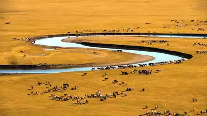 Hailar is a city surrounded by grasslands, and the grasslands are visible as soon as you leave the city. After breakfast, we will depart Hailar and, in less than half an hour, we will be immersed in the boundless grasslands of Inner Mongolia. Autumn in Hulunbuir is like God overturning his palette. The grasslands are covered in golden color. Tender, half-human-high grass curls are scattered across the endless pastures, providing winter food for cattle and sheep and a symbol of autumn on the grasslands. The winding streams across the grasslands are not called rivers, but winding rivers. We will take you to an observation deck, where you can see the Morigele River, known as "the world's most winding river." This is also one of the best photography spots on the Hulunbuir grasslands.