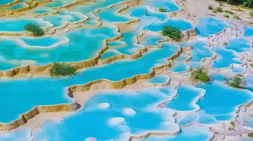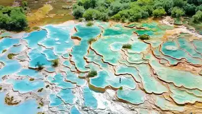 This scenery should only exist in heaven; nowhere on earth could Huanglong Pond (Note 3) exist. Huanglong is renowned for its "Four Wonders": colorful pools, high mountains, canyons, and forests. Adding these to its "Seven Wonders": rapids, ancient temples, and folk customs, it's known as "Seven Wonders." While Huanglong strives to preserve the pristine beauty of the plateau, strolling along the wooden plank road and breathing in the fresh, pure air is a truly breathtaking experience. The scenic area sits at an altitude of 3,560 meters. We offer a cable car ride for tourists, allowing them to hike down from the top. This not only saves energy but also offers a panoramic view of the calcified pools. The scenic area is comprised of over 500 pools of varying sizes, each one akin to a palette filled with vibrant colors, shimmering brilliantly in the sunlight. The waters are crystal clear, their colors changing as the grayish-white travertine and yellow-green algae at the lake bottom selectively absorb and reflect transmitted light, creating a scene reminiscent of a fairyland on earth.