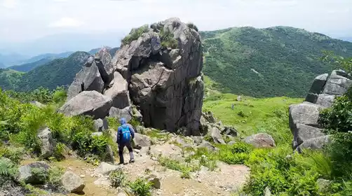 We set off towards the summit around 12:30 PM and reached Blacksmith Peak around 1:00 PM. Blacksmith Mountain slopes westward toward the Wuyue Ancient Road and Tianchi Lake in western Zhejiang, and eastward to Huanghua Pass and Daochangping, where alpine meadows stretch endlessly. Blacksmith Peak, at 1,180 meters, stands out prominently against the lush Dragon Spine of Tianmu Mountain, seemingly descending from outer space, like a meteorite that has fallen onto the Tianmu Mountains. From the summit, we'll enjoy a panoramic view of the surrounding mountains. We'll grab a lunch here, rest, and take photos.