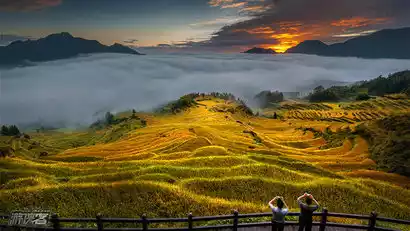 While watching the sunrise, step into the Nine-Turn Cloud Ring. Layers of terraced rice paddies stretch from the foot of the mountain to the summit, twisting and turning like the fabric of nature. Wander through the terraces, overlooking the layers of curves, then walk down the terraces along the ridges, discovering the unique curves as you move through the fields.