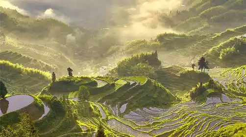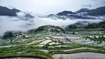 Entering the Nine-Turn Cloud Ring, you'll see layers of terraced fields stretching from the foot of the mountain to the summit, twisting and turning like the fabric of nature. Wander through the terraces, overlooking the layers of curves, and descend along the ridges, discovering the unique curves of the terraces as you move through the fields.