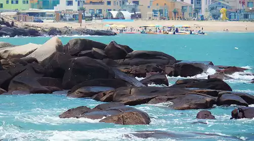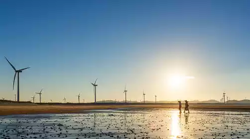 2. Our first stop is the dreamy [Changjiangao Windmill Field]. Clusters of white windmills are scattered around the wide beach, towering over it, their slender blades dancing in the air. After getting off the bus, we'll have about 30 minutes of fun, running freely on the vast beach, or catching cute little crabs and hermit crabs on the rocky beach.
