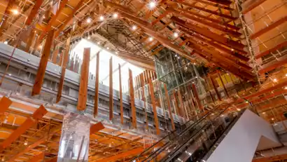 The afternoon began with a visit to the Glass Museum in downtown Toyama. Designed by Japanese architect Kengo Kuma, this museum is the culmination of Toyama's urban planning initiative to create "Toyama, the Glass City." The building's interior, constructed from wood from Toyama Prefecture, features louvers angled at various angles, creating a warm and open feel. The interior's clever use of light and mirrors creates a sense of transparency, and the stained glass works appear magnificent even in the darkness.