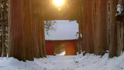 We headed directly to Okusha, the heart of Togakushi Shrine. The approach to Okusha is 2 kilometers long, marked by the thatched Zuishinmon Gate and flanked by towering cedar trees. This 400-year-old cedar forest is a designated Natural Monument of Nagano Prefecture. Surrounded by such a dense, towering cedar forest, simply strolling through it is both empowering and spiritually cleansing. Especially in winter, treading through the thick snow feels like stumbling into a magical winter forest.