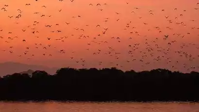 Bats emerge from their nests at sunset, creating a wild and romantic scene in the sky