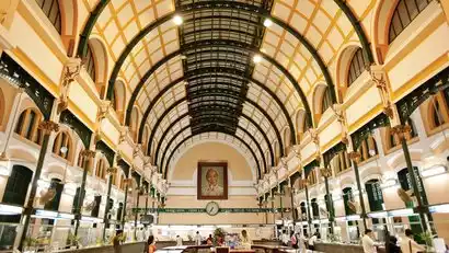 We will then begin our Saigon City Walk (Note 1) and visit Saigon Cathedral, a famous landmark. Modeled after the bell tower of Notre Dame de Paris, the cathedral boasts a symmetrical and majestic form, with two towers reaching 40 meters into the sky. The red bricks used in the cathedral's construction were imported from France, and their color remains vibrant and unfaded even after over a century. Next to the cathedral is the Central Post Office (enter and receive a special postcard). Built in the late 19th century and designed by a French architect, the post office boasts an ornately decorated lobby imbued with a classical ambiance. The spacious lobby is flanked by counters and a circular bench running from the center. Above each side of the lobby are two maps of Vietnam, believed to have been hand-drawn by French geographers. The dome, circular stained glass windows, ornate chandeliers, floral wall lamps, and electric fans all reflect Gothic architectural style.