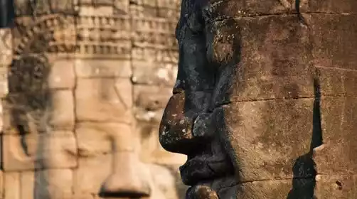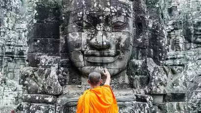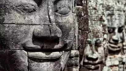 After lunch, we'll travel to Angkor Thom, the ancient capital of the Khmer Empire. Also known as Great Angkor, it's the heart of the Angkor complex. Its walls stretch 14 kilometers in circumference and are surrounded by a moat. We'll continue to the Bayon Temple, the heart of Angkor Thom. Composed of 49 towers of varying sizes, the Bayon boasts a unique design: each tower is engraved with the three-meter-tall smiling face of King Jayavarman VII. Over two hundred smiles emerge from the lush greenery. Their proud brows, balanced nose, warm, full lips, and benevolent demeanor give rise to the Khmer smile.
