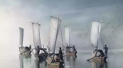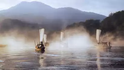 As the sun sets, follow your guide to Tongping Wharf to begin filming the highlight of the day: the sails of the Oujiang River. Here, the waters are vast and the mountains are beautiful. We'll arrange for five distinctive sailboats to sail through the mist. Under the setting sun, experienced boatmen, dressed in straw raincoats, hoist the sails and raise the nets, allowing everyone to enjoy the photo ops.