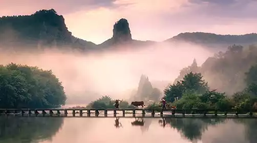 Rise early in the morning to photograph Xiandu Dinghu Peak shrouded in the morning mist (with a farmer leading cattle and models posing for the photo). The picturesque scenery here is the essence of Xiandu. After the photoshoot, return home for breakfast.