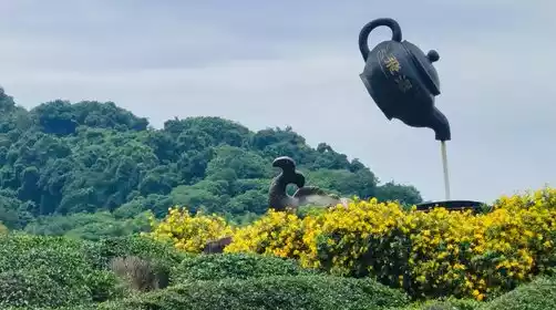 Yunhu Waterfall: Step onto the tea garden observation deck and you will see a hundred acres of tea garden. Looking out into the distance, you will see a teapot about two meters in diameter hanging upside down in the air, with a stream of water spraying out of the spout, which then turns into smoke and dissipates in the air.