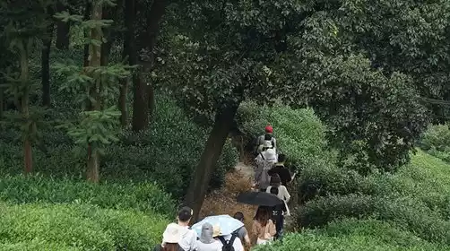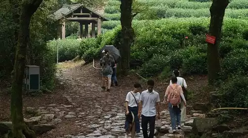 The rest of the path was relatively flat, and we walked along the bluestone slabs along the mountain ridge, enjoying a panoramic view overlooking the terraced tea plantations. [Longjing Village] was surrounded by greenery, with white walls and black tiles, like a landscape painting. Following the [Shili Langyao] path, we entered Longjing Village. Legend has it that when Emperor Qianlong traveled south of the Yangtze River, he visited the Hu Gong Temple at the foot of Shifeng Mountain in Longjing Village to taste West Lake Longjing tea. He praised it so much that he named the 18 tea trees in front of the temple "Imperial Tea." The village is filled with the fragrance of tea, and it's a great place to sit down with a few friends to enjoy tea and chat.