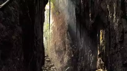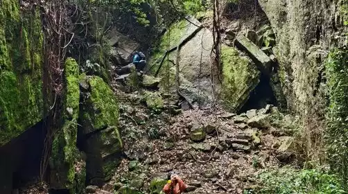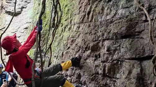 We arrived at the Quzha Ancestral Temple and, under the guidance of our team leader, rested and warmed up. Then, the hike began! We climbed up the dirt path, climbing up and down rocks amidst the lush vegetation, feeling like we'd strayed into a lush green forest. After about half an hour, we reached the "One Line Sky" (a narrow passageway) at the end of the mountain. There are two, one large and one small, with vines entwined and thick enough to hang a swing from. Sunlight shone on the exposed rock faces and the dripping moss. Walking among them, I felt the insignificance of humanity in the face of nature.
