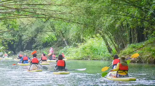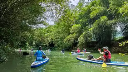 Arriving at the base, the coach explained the basics of paddleboarding and paddling techniques. We put on our life jackets and prepared to enter the water. We paddled down the Lianjiang River, enjoying the countryside and mountains along the way. The green on both sides and the scattered peaks in the distance made us think we were in Guilin, traveling in the picturesque scenery. The paddling distance was 8 kilometers.