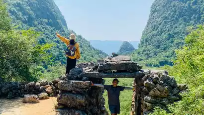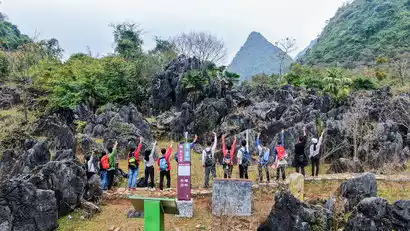 After a warm-up, we began our light hike. The main section of the ancient trail is hidden within the rarely visited karst mountains, with the entrance located behind residential buildings. Halfway up the mountain, we'll enjoy a panoramic view of the Shuikou Lianjiang Gallery. From the trail, we'll gaze up at the peaks and forests on either side, admiring the myriad karst formations, ancient camphor trees, ancient stone gates, and stone forests. This stone forest is the largest contiguous Yangshilin (Yangshilin) forest discovered in Guangdong. Hiking this section of the Qin and Han Dynasty Trail, the ruins of old villages nestled among the jungle bear witness to the passage of time. Occasionally, smoke curls from the chimneys of homes, akin to a paradise on earth, embodying the tranquility, nature, and harmonious rural life.