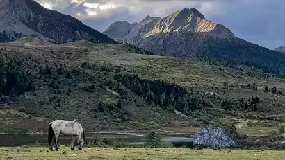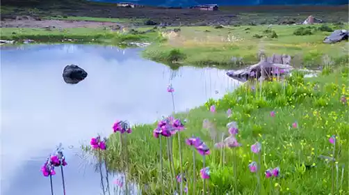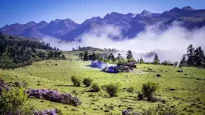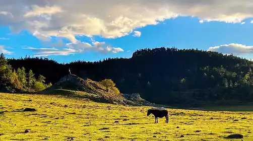 We will hike to the Burnt Forest, check in and take photos there, and then arrive at the Black Lake. Along the way, the undulating pastures are blooming with colorful flowers, and cattle and sheep are leisurely grazing on the grass. The cabins on the meadows and the clear mountain lakes make it seem like entering a fairyland in the clouds.