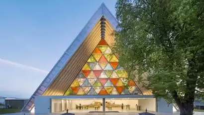 The Cardboard Cathedral. This temporary church, designed and rebuilt by Japanese designer Shigeru Ban, was built a block away from the ruins of the cathedral. The building has an A-shaped concrete base, with cardboard rolls forming the sides and shipping containers supporting the walls. Stained glass windows are inlaid at either end.