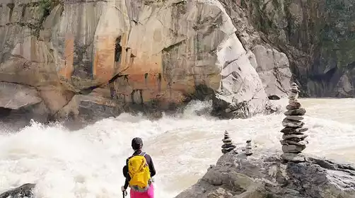 Led by a guide, explore Tiger Leaping Gorge along the Tiger Leaping Gorge High Route. This mostly flat route features a few descents. This section, considered one of the world's ten most iconic hiking routes, is renowned for its breathtaking beauty and dramatic scenery (risk management is recommended). Experience breathtaking drops and breathtaking rock faces on the cliff path. Sunlight streams into the canyon, shimmering on the water at the gorge's more than ten-meter-wide mouth. Below, the river ripples in whitecaps, surging from the drop. Above, the illuminated cliffs, blue sky, and white clouds create a breathtaking, breathtaking scenery.