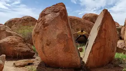 We then passed by the Devil's Marbles, where giant, rounded stones are scattered across a wide, shallow valley. The seemingly precarious stacks, yet their magical balance, are truly incredible. Some, when split, resemble potatoes cut in half. These fascinating rocks, in a variety of shapes and forms, create a unique and mysterious beauty amidst the pink clouds at sunrise and sunset. Local mythology suggests that these massive, rounded rocks are the eggs of the guardian rainbow serpent, while others believe that aliens have been visiting and lingering among these bizarre rocks for thousands of years. Millions of years of erosion, weathering, and exposure to sun and rain have shaped the granite landscape, averaging four meters in height. The enigmatic landscape is truly captivating.