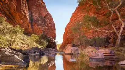 After breakfast, we'll drive to Kings Canyon, passing through Simpson Gorge. This is one of the most famous gorges in the West MacDonnell Ranges, 18 kilometers from Alice Springs. It boasts the towering Simpson Range escarpment, a perennial waterhole, and a diverse wildlife habitat. The gorges feature acacias, a signature vegetation of the MacDonnell Ranges, as well as over 40 rare and endangered plant species. Many short walks offer stunning views of the native vegetation (including ancient white-trunk gums) and the surrounding scenery.