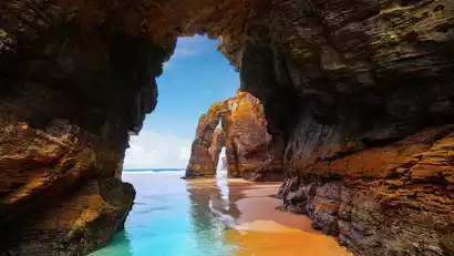 Departing at the perfect time, we arrived at the Cathedral Coast, a beach carved by waves and wind. These cliffs, eroded by wind and sea, have formed spectacular arches and vaults, making it one of the most beautiful beaches in the world. When the tide recedes, the cliffs resemble the flying buttresses of a cathedral, and the rock formations resemble whimsical sculptures. The beach stretches approximately 1.5 kilometers, and walking along it creates a sense of isolation and awe.