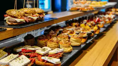 Tips: Tapas and Pintxos are very similar. Tapas are usually served on a plate, while Pintxos are made by placing various elements of the dish on a piece of bread and then piercing them with bamboo sticks to secure and string them together.