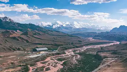 As we continued westward, the majestic Kunlun Mountains loomed on our left, while the 2,500-kilometer-long Tianshan Mountains stretched to our right. These two vast mountain ranges gradually approached and converged here. We arrived at the Tianshan + Kunlun Mountain Intersection Observation Deck, where the Tianshan Mountains appeared camel-colored and the Kunlun Mountains dark blue. We took in the unique features of these two magnificent mountain ranges and experienced the spectacular mountain-building movement.