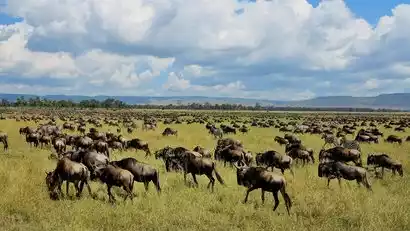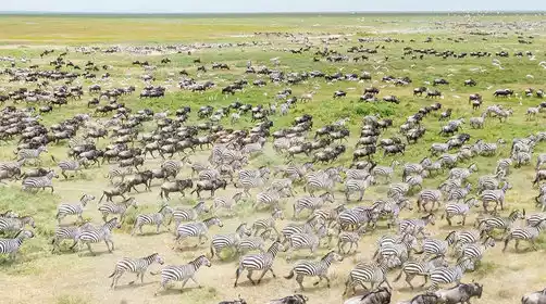 The East African Great Migration, a regular annual migration of wildebeest, zebra, and gazelle, occurs between the Serengeti savannah in Tanzania and the Masai Mara in Kenya. Wildlife (primarily wildebeest, zebra, and gazelle) seek water and grazing. Over 80% of the migration takes place in the Serengeti savannah in Tanzania.