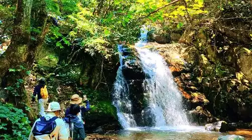 We arrived at the entrance of the Black Hole Waterfalls, walked through the bamboo forest to the Black Hole Waterfalls, and successively crossed the waterfalls, the "Little Three Gorges", the "Ladder to Heaven", the Immortal Planting Trees, the Sweet Cave, and the "Heavenly Girl Scattering Flowers".