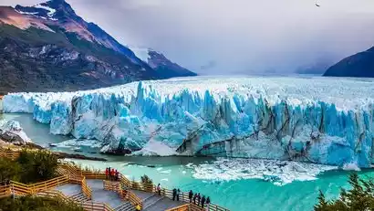 After breakfast, we'll drive to Los Glaciares National Park (no less than 2.5 hours). It comprises 47 glaciers of varying sizes, most notably the Perito Moreno Glacier, one of the Eight Wonders of the World. Covering 257 square kilometers, it's one of the world's three largest glaciers and one of the few still growing, offering breathtaking scenery. From a specially constructed viewing platform, visitors can witness the glacier's cascading cascade from the snow-capped peaks. The glacier's face is as straight as a knife, its summit crisscrossed by countless crevasses, which filter and refract sunlight, creating a vibrant display of color. From time to time, a low rumble echoes from the glacier, the sound of the calving glacier.
