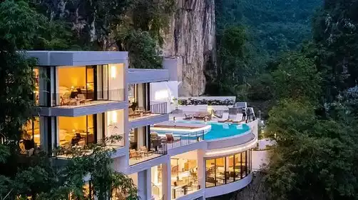 Fengxi Cave B&B in Xingyi, nestled on the edge of a cliff, is unlike any other hotel, resembling a work of art and a fairyland. Here, you can escape the hustle and bustle of the city and enjoy the tranquility of the mountains and lakes, relaxing both body and mind. The nine rooms offer expansive views, including large 180-degree floor-to-ceiling windows, offering breathtaking views of the magnificent karst mountains and the shimmering Wanfeng Lake. The reflections of the blue sky, white clouds, and verdant mountains and waters on the lake's surface are breathtaking. The U-shaped landscaped swimming pool in the public area creates a truly relaxing vacation experience.