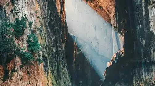 A fissure in the earth, a waterfall rising from the clouds. The Maling River Grand Canyon is a winding chasm that tears through the Yunnan-Guizhou Plateau. The Upper Baitiao Waterfall cascades down from a cliff edge, like a galloping horse. Once inside the Maling River Grand Canyon, you can enjoy a leisurely hike amidst the natural beauty, hugging the cliffs as the mighty waterfalls pour into the canyon. It's like walking through a masterpiece of painting, a breathtaking spectacle of beauty and wonder.