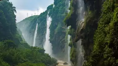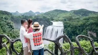 First, we'll visit the Huangguoshu Waterfall. The water, drawn from the Baishui River, cascades down from dozens of meters into the air. From a distance, it appears to hang over a river, while up close, it resembles a silver dragon. Its roar is resounding and resonant, and can be heard from far away. We'll enjoy a 360-degree panoramic view of the falls from above, below, front, and back, feeling the charm of nature and marveling at the insignificance of humankind.