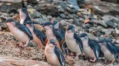 In the evening, watch the Blue-eyed Penguin Parade (approximately 60 minutes). Every evening, flocks of blue penguins gather offshore, awaiting darkness. They then swim to the bottom of the viewing platform, climb the steep shore, rest briefly on top of the rock face, and then return to their habitat across the viewing area.