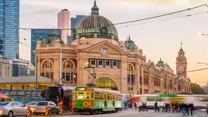 Take the [City Tram] (about 20 minutes): Trams are one of Melbourne's city images, with dark wine red bodies and dark green roofs, all exuding a strong retro feeling.