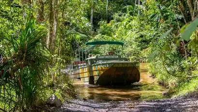 Enter the Rainforest Cultural Village. Inside, tourists will ride an amphibious vehicle into the world's oldest tropical rainforest, gaining a deeper understanding of this beautiful land. The vehicle enters the water, its propellers ignited, and it slowly moves!