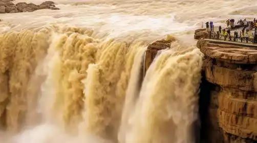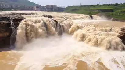 As the Yellow River flows through the Huangshi Plateau and into the Qin-Jin Gorge, the riverbed suddenly narrows from 400 to 50 meters wide to 40 to 50 meters, resembling a giant pot pouring out water, hence the name Hukou Waterfall. Hukou Waterfall is magnificent, especially during the "Peach Blossom Flood" (April to May) and the "Hukou Autumn Wind" (September to November), when the water reaches its peak. Here, the 300 to 400-meter-wide Yellow River suddenly narrows to 30 to 40 meters, creating a turbulent, roaring river. Visitors will deeply feel the awe of the Yellow River's celestial presence. On clear days, the mist created by the water creates a rainbow above the waterfall, a truly auspicious sight.